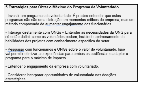 O conteúdo inclui ainda reflexões sobre como integrar o voluntariado a estratégias mais amplas de doação e investimento social privado, além de formas de monitorar o engajamento dentro das empresas.