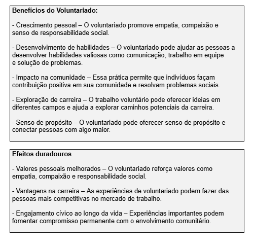 Além dos impactos institucionais, o voluntariado é apresentado como uma experiência com efeitos individuais duradouros. Entre os benefícios citados estão o desenvolvimento de valores como empatia e responsabilidade social, o fortalecimento de habilidades profissionais e a possibilidade de explorar caminhos de carreira. A participação em ações voluntárias também tende a estimular o engajamento cívico ao longo do tempo.